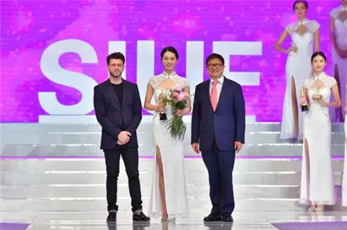 SIUF创始人张峰伟、SIUF2015国际内衣超模选秀大会总决赛冠军姜贝贝为冠军吴奕霏颁发奖杯