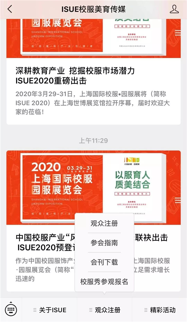 关注官方微信公众号“ISUE校服美育传媒”点击底部"观众注册“,完成预登记后可在开展当日在现场领取精美“展会定制礼品”一个。