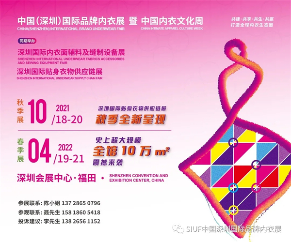 经过16年的精心培育,深圳内衣展已成为全球最具规模和影响力的行业价值服务平台。SIUF怀揣“共建·共享·共生·共赢,打造全球内衣生态圈”的愿景,在产业振兴的路上砥砺前行不停歇,为全球呈现一个又一个更为国际化、时尚化、专业化的顶级盛会。为了更好地引领全球内衣时尚,SIUF中国(深圳)国际品牌内衣展将于2022年4月19-21日再度来袭,以梦为马,踏上新征程!