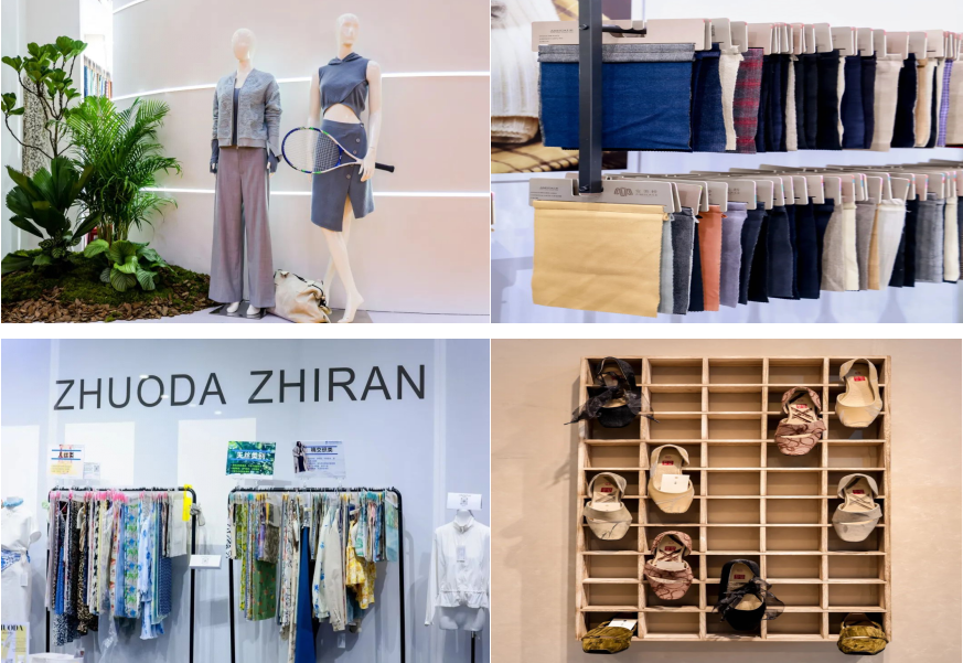 沃倫特、箭鹿、万新、东企、德信、依蕾等纱线企业,展出了多种创新纱线产品,涵盖高科技环保材料与功能性纱线的多元化选择;渡人鞋业、泛客潮品、边福茂、三岱等品牌则带来了精致的时尚鞋履与配饰;观帛、大新、钜锦、安美桥、新昌景、卓达等展商的面料展示,立足环保理念,呈现了创新材质面料。